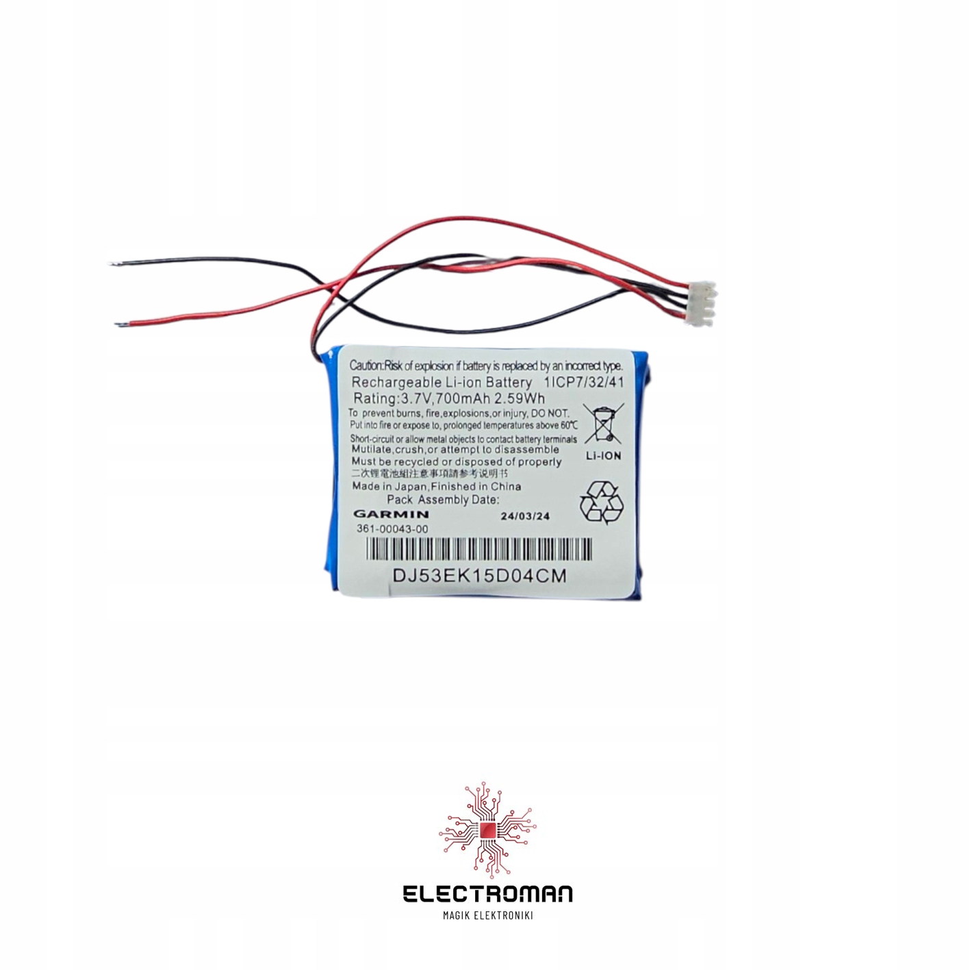 Oferujemy oryginalny akumulator litowo-jonowy Garmin o pojemności 700mAh (3.7V, 2.59Wh), model 361-00043-00 / DJ53EK15D04CM, stosowany w wybranych urządzeniach GPS i zegarkach Garmin.